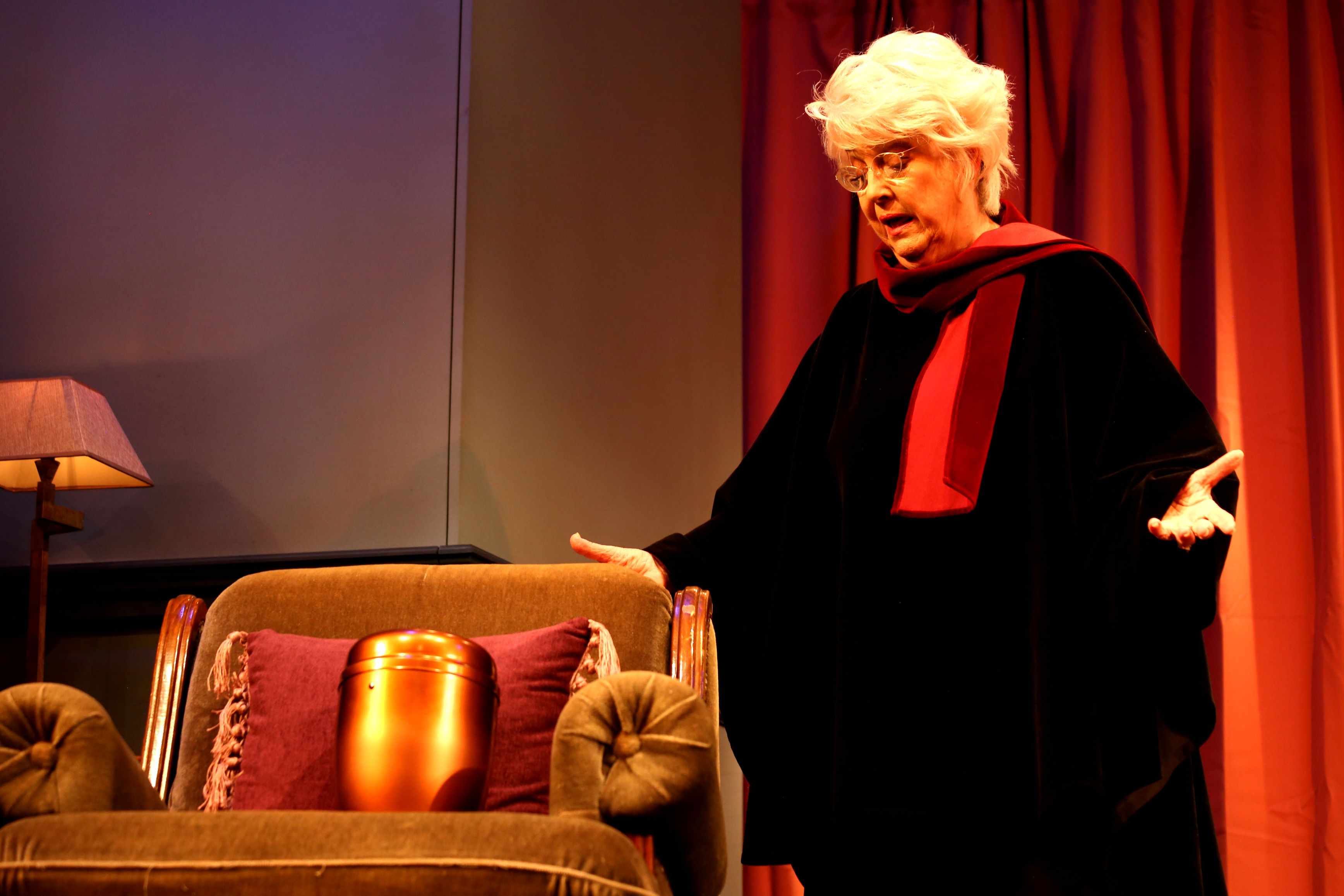 Komédia jedného z najúspešnejších škandinávskych dramatikov Bengta Ahlforsa. Príbeh plný čierneho humoru, v ktorom nechýba životný optimizmus, láskavosť a láska, ktorá kvitne v každom veku... V pomerne čiernej komédii o manželstve, vzťahu rodičov a dospelých detí, urne s popolom, domácej pálenke a starostlivo utajených plánoch, ktoré nakoniec aj tak vyjdú najavo, exceluje v hlavnej úlohe Božidara Turzonovová. Hra z pera súčasného fínskeho autora sa odohráva v jednej trochu pomätenej rodine. Svojrázna pani plukovníková sa rozhodne, že si urnu svojho práve zosnulého manžela odnesie z cintorína domov, čo vnukne jej potomkom nápad, ako sa zmocniť dedičstva po svojom otcovi. Pretože im k utajenej realizácii plánu chýba dôvtip, skončí všetko krachom a celá hra nečakaným happyendom.